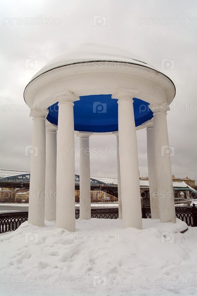 Ротонда в парке Горького в зимнее время на фоне Пушкинского моста в Москве