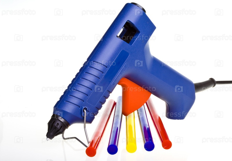 Термоклеевой пистолет и разноцветные клеевые стержни на белом фоне