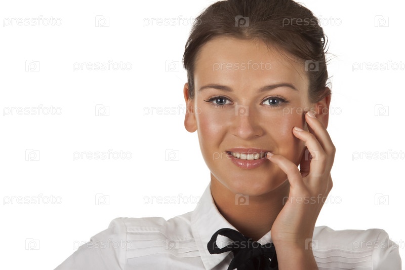 Кокетливая симпатичная девушка в белой блузке с бантом, изолированная на белом фоне