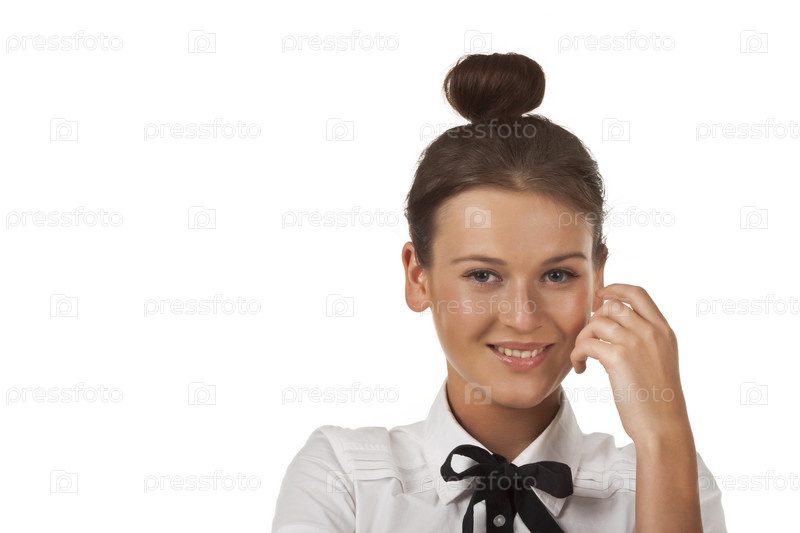 Кокетливая симпатичная девушка в белой блузке с бантом, изолированная на белом фоне