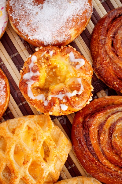 Печенье и булочки крупным планом на бамбуковой салфетке