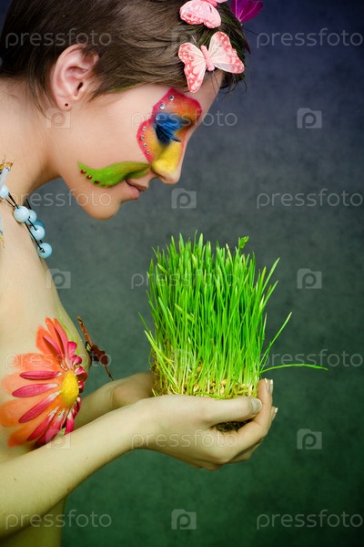 Красивая женщина с бабочкой и травой в руках. Боди-арт