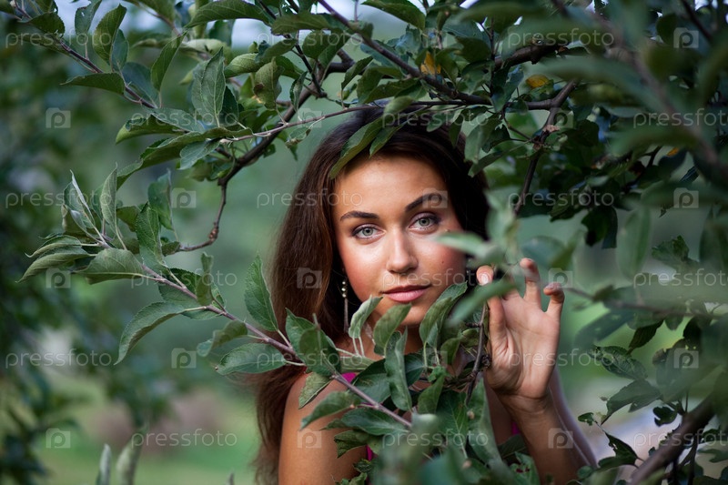Портрет молодой брюнетки в ветках дерева