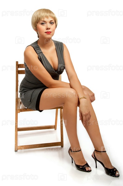 Девушка в платье сидит на стуле, на белом фоне