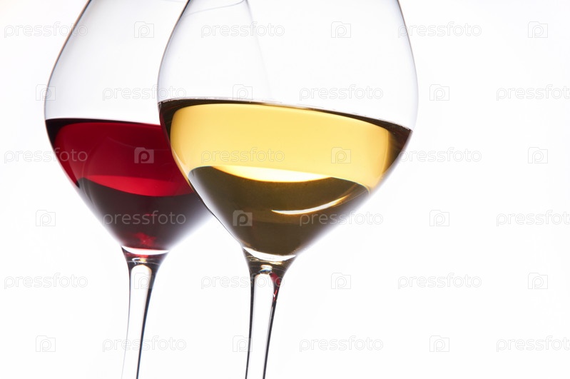 Красное и белое вино в бокалах на белом фоне