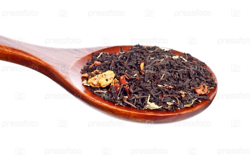 Деревянная ложка с чайной заваркой, на белом фоне