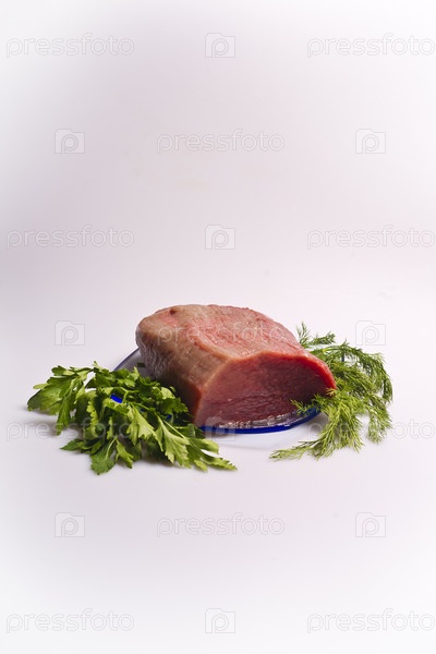 Сырое красное мясо и зелень на бело-розовом фоне