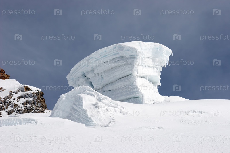 Огромный ледяной блок с вытянутыми карнизами в ледовом водопаде, горы Кордильера-Бланка, Перу