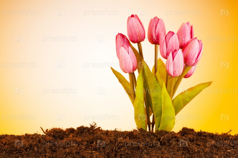 Розовые тюльпаны на клумбе на ярко-желтом фоне
