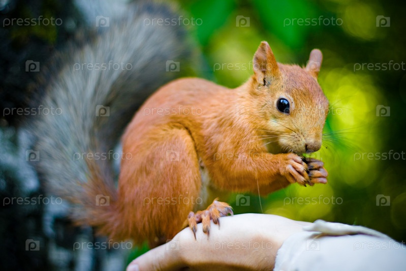 Рыжая белка ест, сидя на руке человека