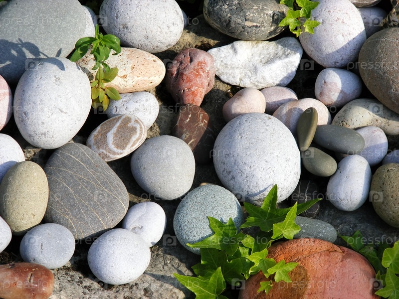 Состав множества гладких камней, среди зеленых листьев