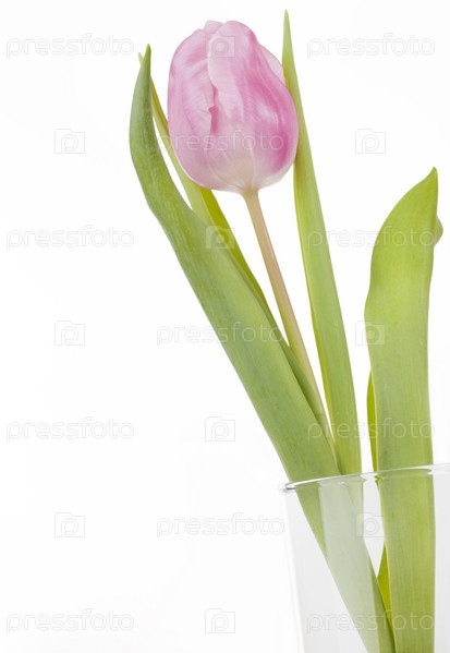 Розовый тюльпан в стеклянной вазе крупным планом, на белом фоне