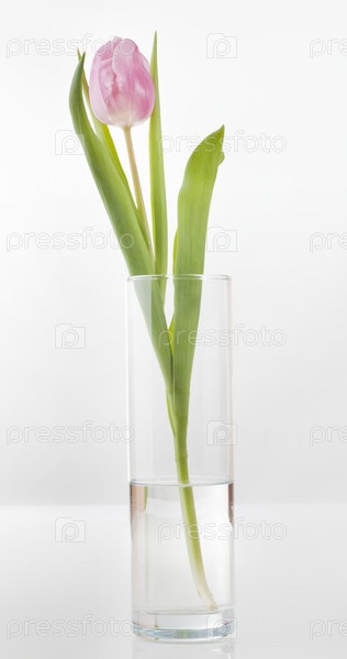 Розовый тюльпан в стеклянной вазе крупным планом, на белом фоне