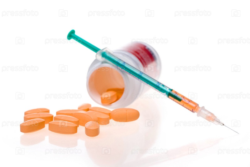 Таблетки и шприц на белом фоне