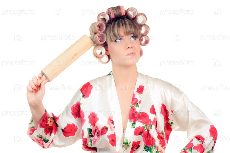 Домохозяйка со скалкой на белом фоне