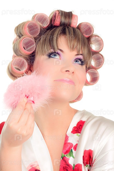 Домохозяйка с пуховкой на белом фоне