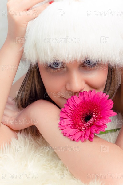 Девушка в меховой шапке с цветком