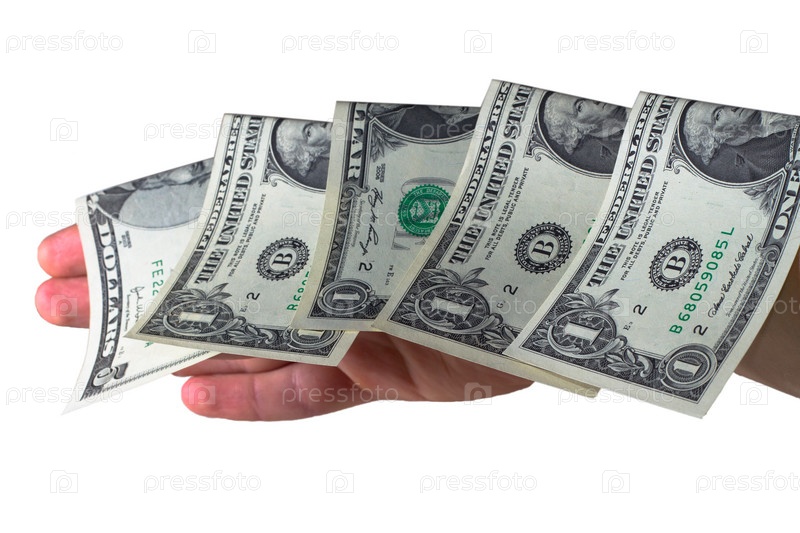 Долларовые купюры на руке, крупный план на белом фоне