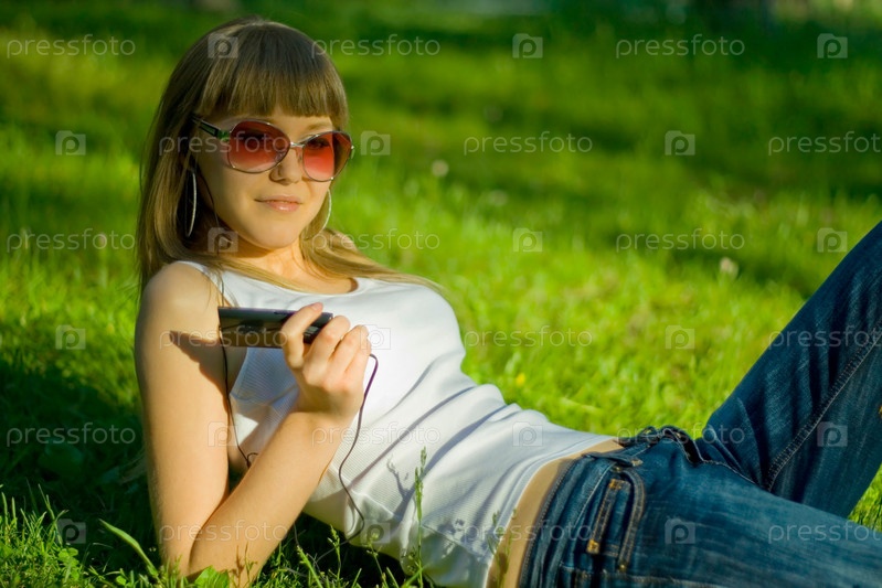 Девушка в темных очках на зеленой лужайке