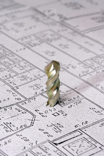 Сверло большого диаметра протыкает чертеж здания