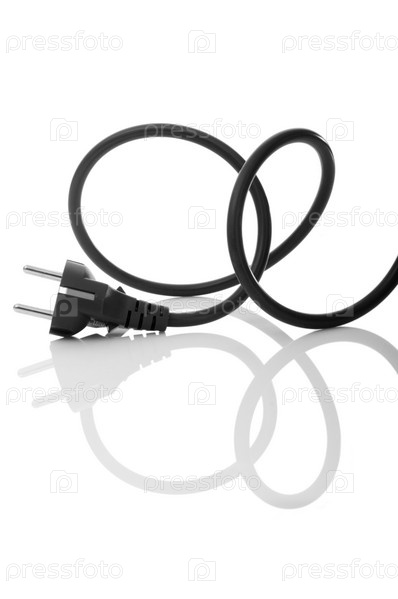 Черный провод с вилкой на белом фоне с отражением