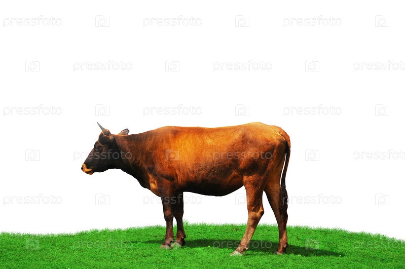 Рыжая корова на зеленом пастбище на белом фоне