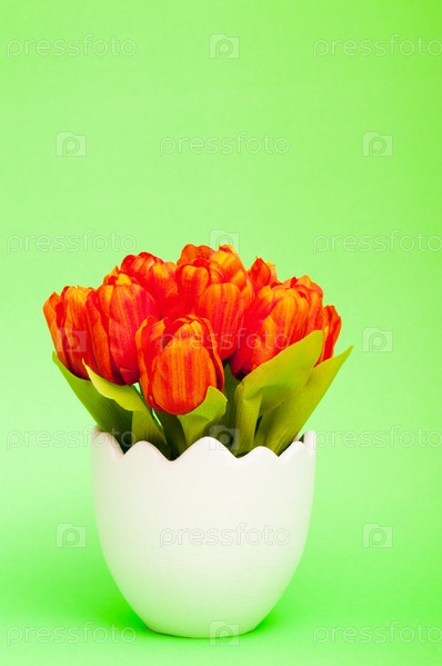 Тюльпаны в горшке на зеленом фоне