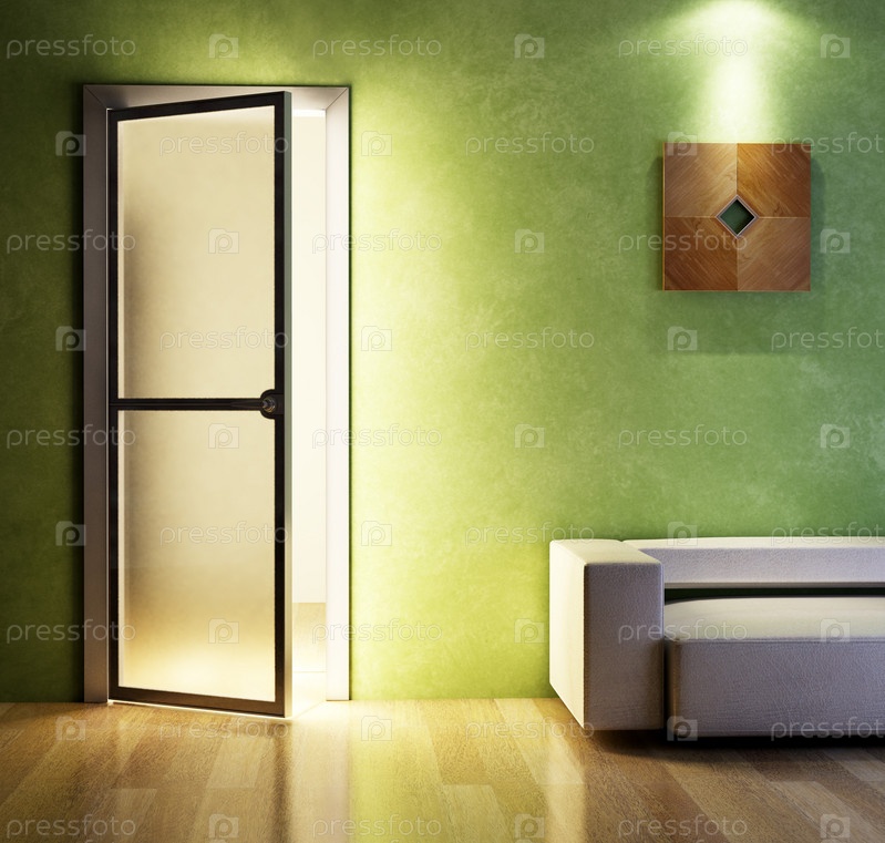 Современный белый диван на фоне зеленой оштукатуренной стены