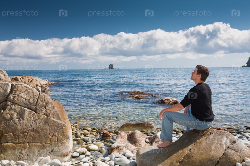 Молодой человек сидит на каменистом берегу моря