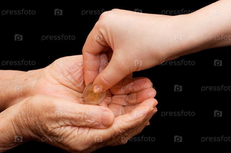 Молодая рука кладет монету в старую руку
