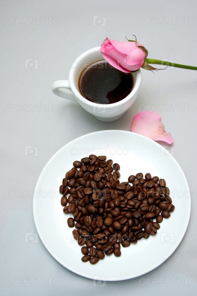 Чашка кофе и кофейные зерна в форме сердца на тарелке