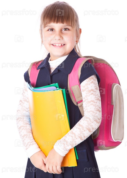 Девочка с рюкзаком и папками, изолирована на белом фоне