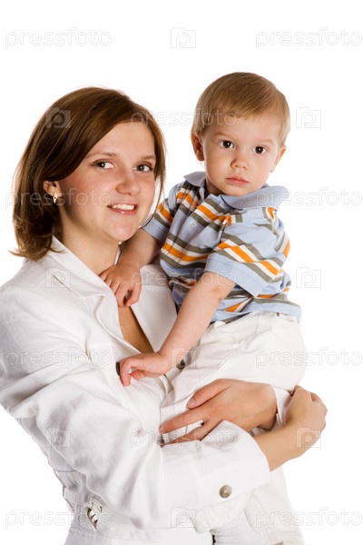 Мать с маленьким сыном на руках на белом фоне