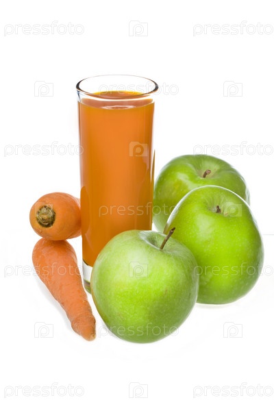 Спелые яблоки, морковь и стакан сока