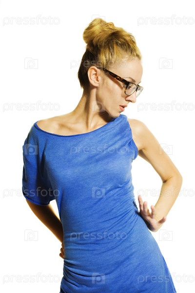 Молодая женщина в очках и синем платье, изолирована на белом фоне