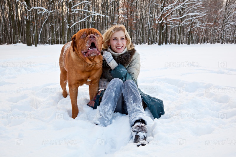 Женщина сидит на снегу с собакой