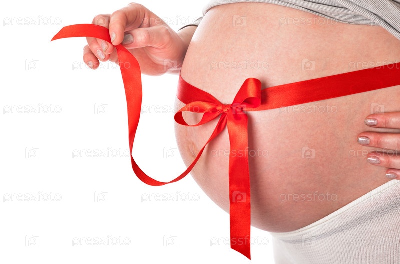 Живот беременной женщины, перевязанный красной подарочной лентой, на белом фоне