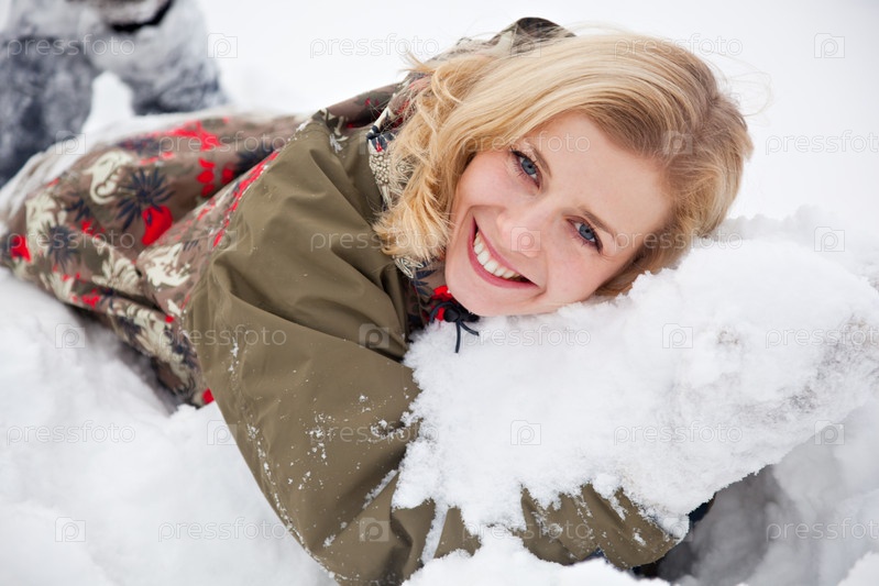 Красивая женщина лежит на снегу в парке