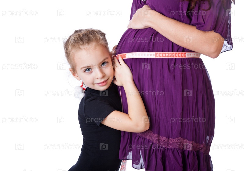 Девочка измеряет живот беременной матери, изолирована на белом фоне