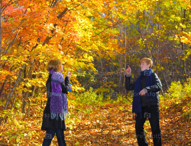 Молодой парень и девушка в осеннем лесу