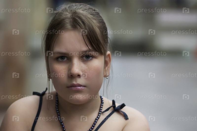 Девушка в черных бусах смотрит в камеру