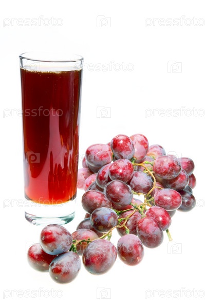 Гроздь винограда и стакан виноградного сока на белом фоне
