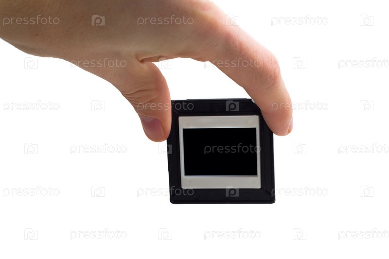 Рука держит рамку для слайдов, крупный план на белом фоне