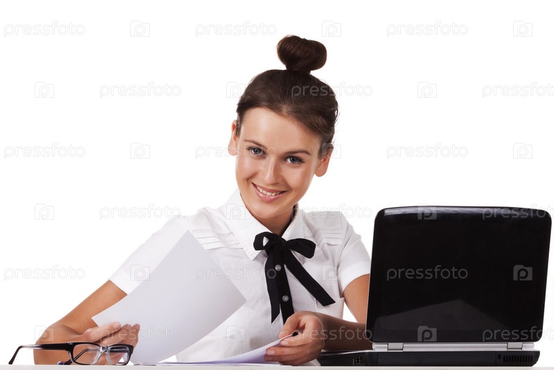 Кокетливая симпатичная девушка в белой блузке с ноутбуком, на белом фоне