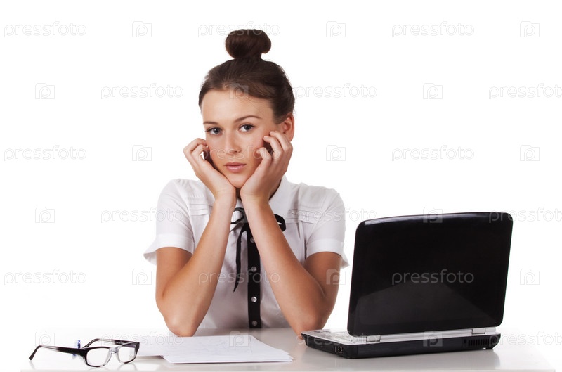 Кокетливая симпатичная девушка в белой блузке с ноутбуком, на белом фоне