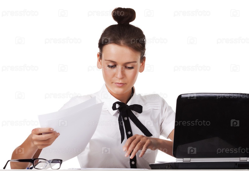 Симпатичная девушка в белой блузке с документами и ноутбуком, на белом фоне