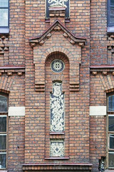 Кирпичный фасад старого здания, украшенный орнаментом