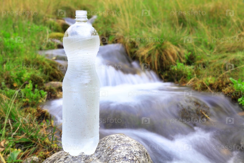 Пластиковая бутылка с чистой водой возле ручья