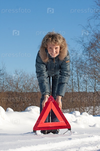 Женщина в солнечный зимний день ставит на дороге предупреждающий дорожный знак