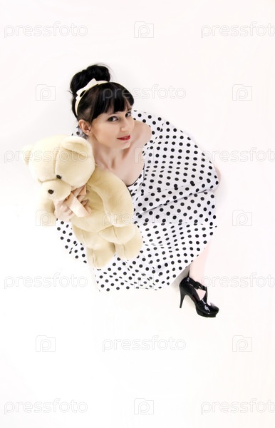 Стильная брюнетка с плюшевым мишкой на белом фоне